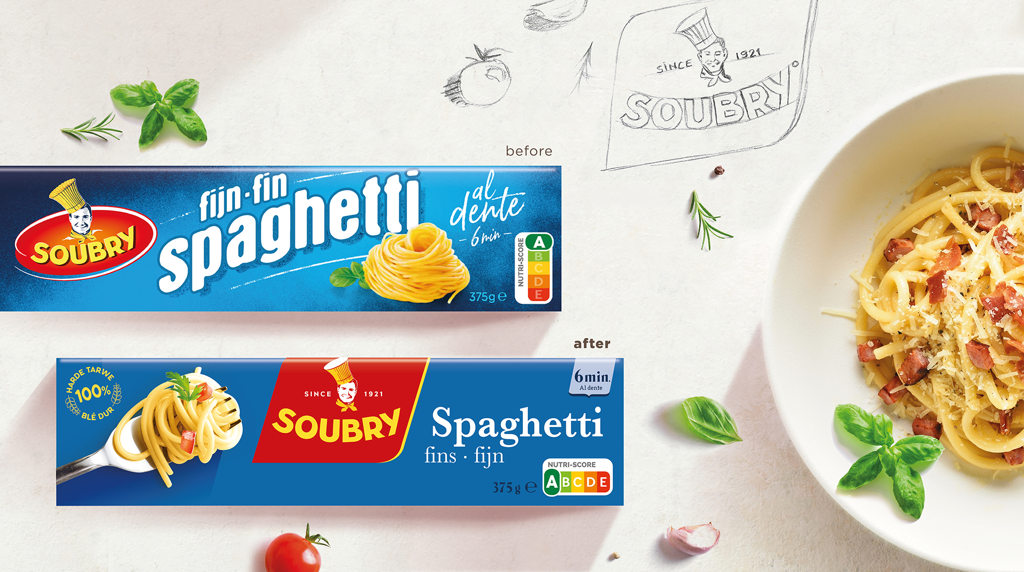 Our new brand identity retains the iconic red and yellow colors while eliminating gradients and the greyish tones in the portrait of Mr. Soubry. The brand now takes center stage on the packaging instead of being tucked on the left, ensuring consistency across both horizontal and vertical pack formats.